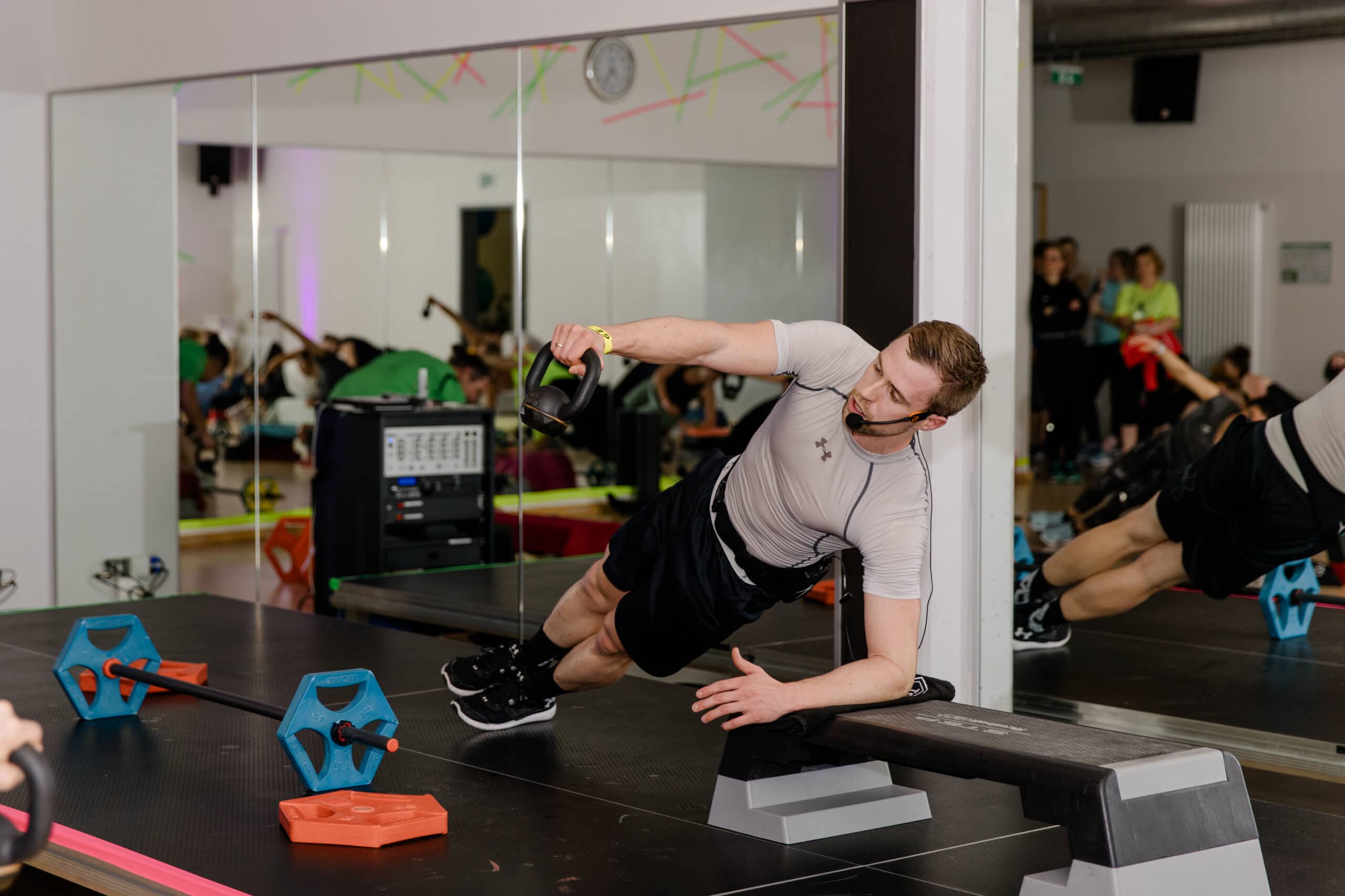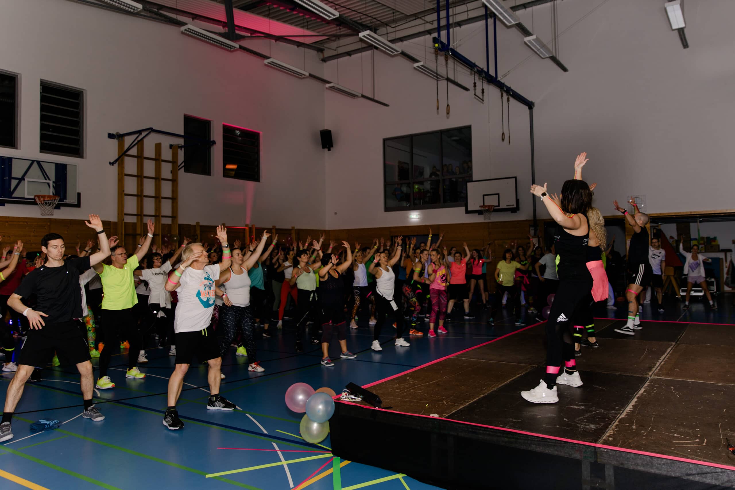 Punkt 17:30 Uhr strömten die Teilnehmer ins Haus, bereit für einen Abend Fitnesssport nonstop. Trotz der gleichzeitigen EM-Handballübertragung ließen sich 450 Personen nicht von diesem Sportabend abhalten. Die Stimmung war in den sieben Hallen und Kursräumen von Anfang an super und riss über den Abend nicht ab. Highlight und Premiere war in diesem Jahr das installierte UV-Licht – gemäß dem Motto „Glow in the Dark“ leuchteten die Trainer und Sportler in Neon und Weiß und verbreiteten so das Gefühl als wäre man auf einer riesengroßen Fitnessparty.